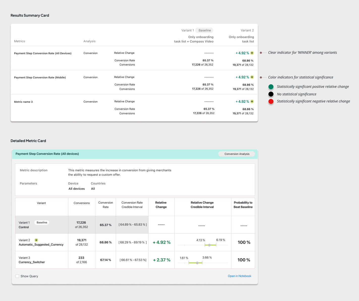 To bring more simplicity, we replaced confidence level with ‘Probability to beat baseline’. A percentage that shows the likelihood that the test variant gets better conversion rate than the baseline variant (or control group). This helps users decide with a clearer information.